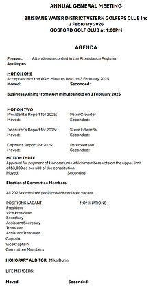 Due to unusual circumstances, the AGM scheduled for the 2nd of February at Gosford Golf Club could not proceed. It will now be held after golf on the 30th of March at Breakers Country Club, Dover Road, Wamberal. We appreciate your understanding and look forward to seeing there. Your participation is important, and we encourage all members to join us for this event.